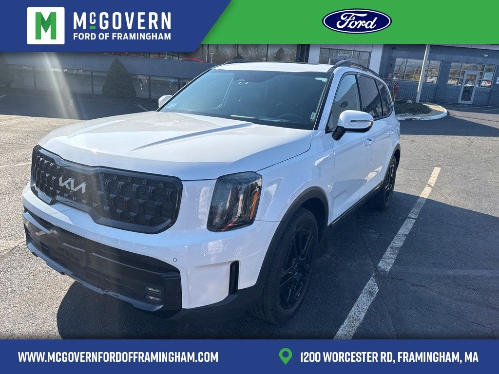 Navigation System|10 Speakers|AM/FM radio: SiriusXM|harman/kardon® Speakers|Radio data system|Radio: AM/FM Harman Kardon Audio System|Rear audio controls|Air Conditioning|Automatic temperature control|Front dual zone A/C|Rear air conditioning|Rear window defroster|Memory seat|Power driver seat|Power steering|Power windows|Remote keyless entry|Smart Key w/ Push Button and Remote Start|Steering wheel mounted audio controls|Four wheel independent suspension|Speed-sensing steering|Traction control|4-Wheel Disc Brakes|ABS brakes|Dual front impact airbags|Dual front side impact airbags|Emergency communication system: 911 Connect|Front anti-roll bar|Knee airbag|Low tire pressure warning|Occupant sensing airbag|Overhead airbag|Rear anti-roll bar|Rear side impact airbag|Power moonroof|Power Liftgate|Brake assist|Electronic Stability Control|Exterior Parking Camera Rear|Auto High-beam Headlights|Delay-off headlights|Front fog lights|Fully automatic headlights|Panic alarm|Security system|Speed control|Bumpers: body-color|Heated door mirrors|Power door mirrors|Roof rack: rails only|Spoiler|Turn signal indicator mirrors|Apple CarPlay & Android Auto|Auto-dimming Rear-View mirror|Carpet Floor Mats|Compass|Driver door bin|Driver vanity mirror|Front reading lights|Garage door transmitter: HomeLink|Heated steering wheel|Illuminated entry|Leather Shift Knob|Leather steering wheel|Outside temperature display|Overhead console|Passenger vanity mirror|Rear reading lights|Tachometer|Telescoping steering wheel|Tilt steering wheel|Trip computer|3rd row seats: split-bench|Front Bucket Seats|Front Center Armrest|Heated & Ventilated Front Bucket Seats|Heated front seats|Power passenger seat|Reclining 3rd row seat|Split folding rear seat|Ventilated front seats|Passenger door bin|Alloy wheels|Rear window wiper|Variably intermittent wipers|3.648 Axle Ratio|Features Include: McGovern Ford of Framingham is proud to present this McGovern Certified... Glacial White Pearl 2024 Kia Telluride SX-Prestige X-Line AWD 3.8L V6 DOHC 8-Speed Automatic CARFAX One-Owner. Clean CARFAX.Features Include:PACKAGES:SX Prestige AWD:Dual 123 Inch Panoramic Display with NavigationHarman Kardon Premium Audio SystemHead Up DisplaySurround View MonitorBlind Spot View MonitorNappa Leather Seat TrimHeated and Ventilated Front SeatsHeated and Ventilated Second Row Captain ChairsHeated Steering WheelSmart Key with Push Button StartRemote Start SystemWireless Phone ChargerDigital Rear View MirrorSmart Power LiftgateSX Prestige X Line AWD:20 Inch Black Alloy WheelsX Line Exterior StylingSelf Leveling Rear SuspensionTow ModePAID OPTIONS:Glacial White Pearl PaintSTANDOUT FEATURES:Apple CarPlay Android AutoAuto dimming Rear View MirrorPanoramic Dual SunroofHarman Kardon Premium Audio SystemHead Up DisplayHeated and Ventilated Front SeatsHeated and Ventilated Second Row SeatsHeated Steering WheelSurround View MonitorAll Wheel DriveCertification Program Details: McGovern Certified:* Powertrain Limited Warranty: 5 Years from purchase date up to 100,000 miles * Certified Vehicle History* Rigorous 128 Point Inspection* Warranty Deductible: $100* Roadside Assistance / Trip Reimbursement and Rental Car CoverageWe currently have over 150 frontline, fully serviced, used vehicles ready for immediate delivery. Call us today at 508-879-1320 or come visit us at 1200 Worcester Road, Framingham, MA 01702. Or check us out online at www.mcgovernfordofframingham.com Listed price does not include $595 Dealer Documentation fee to be collected at time of sale.