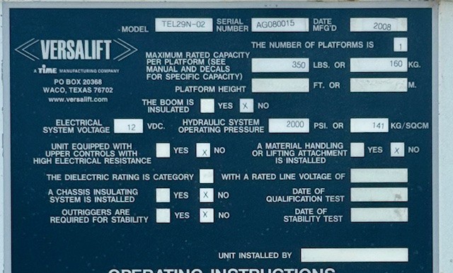 VERSALIFT BUCKET LIFT MODEL #TEL29N-2. Mounted On 11’ Fiberglass Utility Body, 84” CA Required, Price For Body & Boom Only, Cab & Chassis Not Included, $3,800., Cash Talks, Westport, MA 508-636-5050