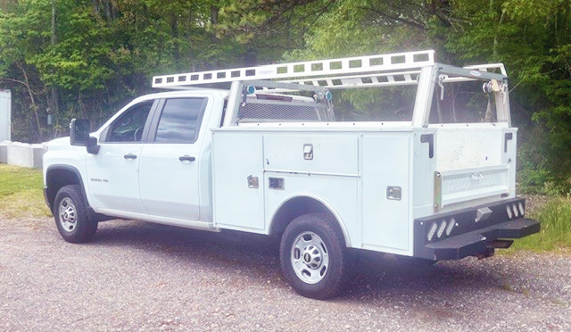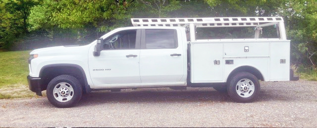 2020 CHEVY 2500 HD CREW CAB 8’ UTILITY BODY RWD. w/System One Ladder Rack, 6.6 Gas, Auto, PW, PL, LED Lighting Pkg, Bluetooth, Backup Camera, 111K, One Owner, Fleet Maintained, $32,800., Westport, MA 508-636-5050