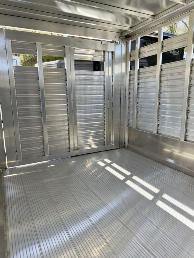 2025 Frontier Aluminum Trailers Livestock Bumper Pull Series 12'7"Frontier's bumper pull aluminum livestock trailers deliver a side access door, extruded aluminum decking, and lots of options.Features may include:10' Floor; 7' Wide; 6'6" TallV-Nose Bumper Pull w/24" Stone GuardAll Box Tube Aluminum ChassisOne Piece .040" Aluminum Roof w/Heavy Duty Radius Roof ExtrusionExtruded Aluminum Decking; 12" O/C I-Beam CrossmembersTandem 3.5K Braked, Dexter Torsion Ride Axles4 Wheel Electric Brakes w/Safety Break-Away KitSilver Mod 225/75R15 6-Lug Wheels.040" Pre-Painted Exterior V-Nose Side Sheets; Extruded Aluminum SidesHeavy Duty Rear Step-Up BumperFull-Length Running BoardsNew Rear Gate Slam Latch System(1) LED Dome Light w/Toggle SwitchTop-Winding Wheel Jack32"x69" Side Access Door w/Locking BarFull Swing Rear Gate w/Air Gaps, Plexitrac, & Sliding Calf Gate w/Heavy Duty Galvanized HardwareCombo Rear Gate With Sliding Calf Gate