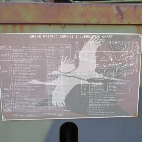 1989 GROVE RT875CC CRANE, 26.5 X 25 RUBBER, CUMMINS POWER, 650 ORIGINAL HOURS, 2 WINCHES, EX-MILITARY. CALL FOR MORE INFORMATION.