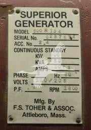 SUPERIOR GENERATOR, 600 KW, 3 PHASE 60 HZ, 120/208 VOLTS, 750 KVA, 30 HOURS. 12 CYCLINDER, 855 CUBIC INCH. STANDBY COMPLETE WITH SWITCH GEAR, BATTERIES, DAY TANK, LIKE NEW CONDITION. CALL FOR MORE INFORMATION