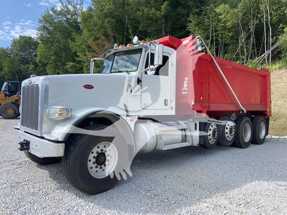 10X4, 485HP PACCAR MX-13 6CYL DIESEL ENGINE, ENGINE BRAKE, EATON FULLER AUTO TRANSMISSION, DIFFERENTIAL LOCK, 20,000LB FRONT & 46,000LB REAR AXLES, 4.10:1 AXLE RATIO, 80K LB GVWR, ALUMINUM WHEELS, 425/65R22.5 FRONT & 11R24.5 REAR TIRES, STEERABLE AIR LIFT TAG AXLE, DUAL STEER BOXES, DOUBLE FRAME, HENDRICKSON HAULMAAX SUSPENSION, 254" WHEELBASE, PTO, 18'L x 5'H HERITAGE STEEL BODY, ELECTRIC ROLL TARP, HIGH-LIFT TAILGATE, M5743, 99000