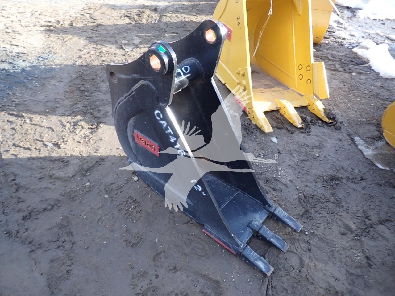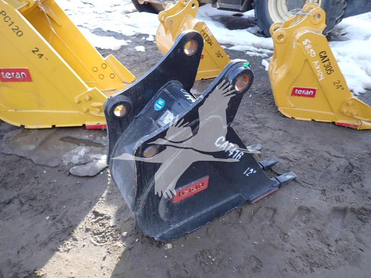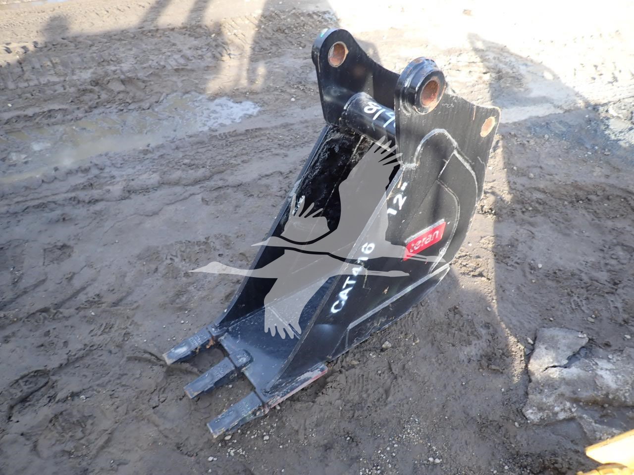 12" digging bucket for Cat 416, 10 1/4" front spread, 8 5/8" rear spread, 14" center to center, 50 mm front pin, 45 mm rear pin