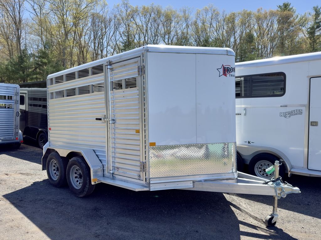 2025 Frontier Aluminum Trailers Livestock Bumper Pull Series 12'7"Frontier's bumper pull aluminum livestock trailers deliver a side access door, extruded aluminum decking, and lots of options.Features may include:10' Floor; 7' Wide; 6'6" TallV-Nose Bumper Pull w/24" Stone GuardAll Box Tube Aluminum ChassisOne Piece .040" Aluminum Roof w/Heavy Duty Radius Roof ExtrusionExtruded Aluminum Decking; 12" O/C I-Beam CrossmembersTandem 3.5K Braked, Dexter Torsion Ride Axles4 Wheel Electric Brakes w/Safety Break-Away KitSilver Mod 225/75R15 6-Lug Wheels.040" Pre-Painted Exterior V-Nose Side Sheets; Extruded Aluminum SidesHeavy Duty Rear Step-Up BumperFull-Length Running BoardsNew Rear Gate Slam Latch System(1) LED Dome Light w/Toggle SwitchTop-Winding Wheel Jack32"x69" Side Access Door w/Locking BarFull Swing Rear Gate w/Air Gaps, Plexitrac, & Sliding Calf Gate w/Heavy Duty Galvanized HardwareCombo Rear Gate With Sliding Calf Gate