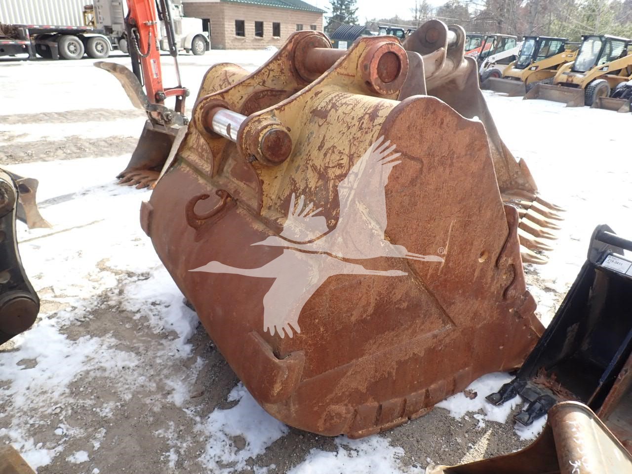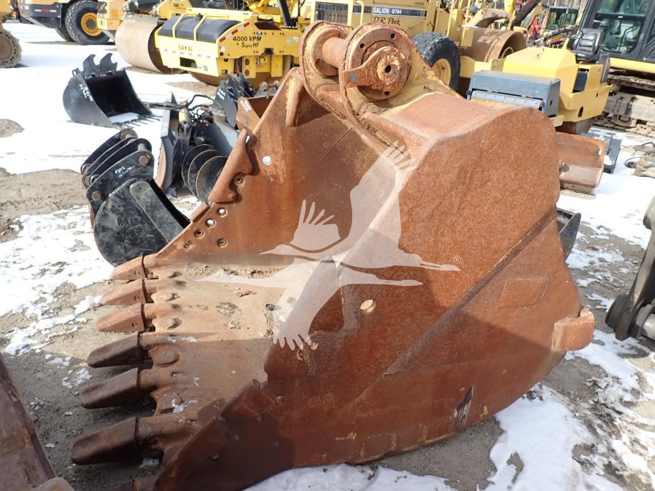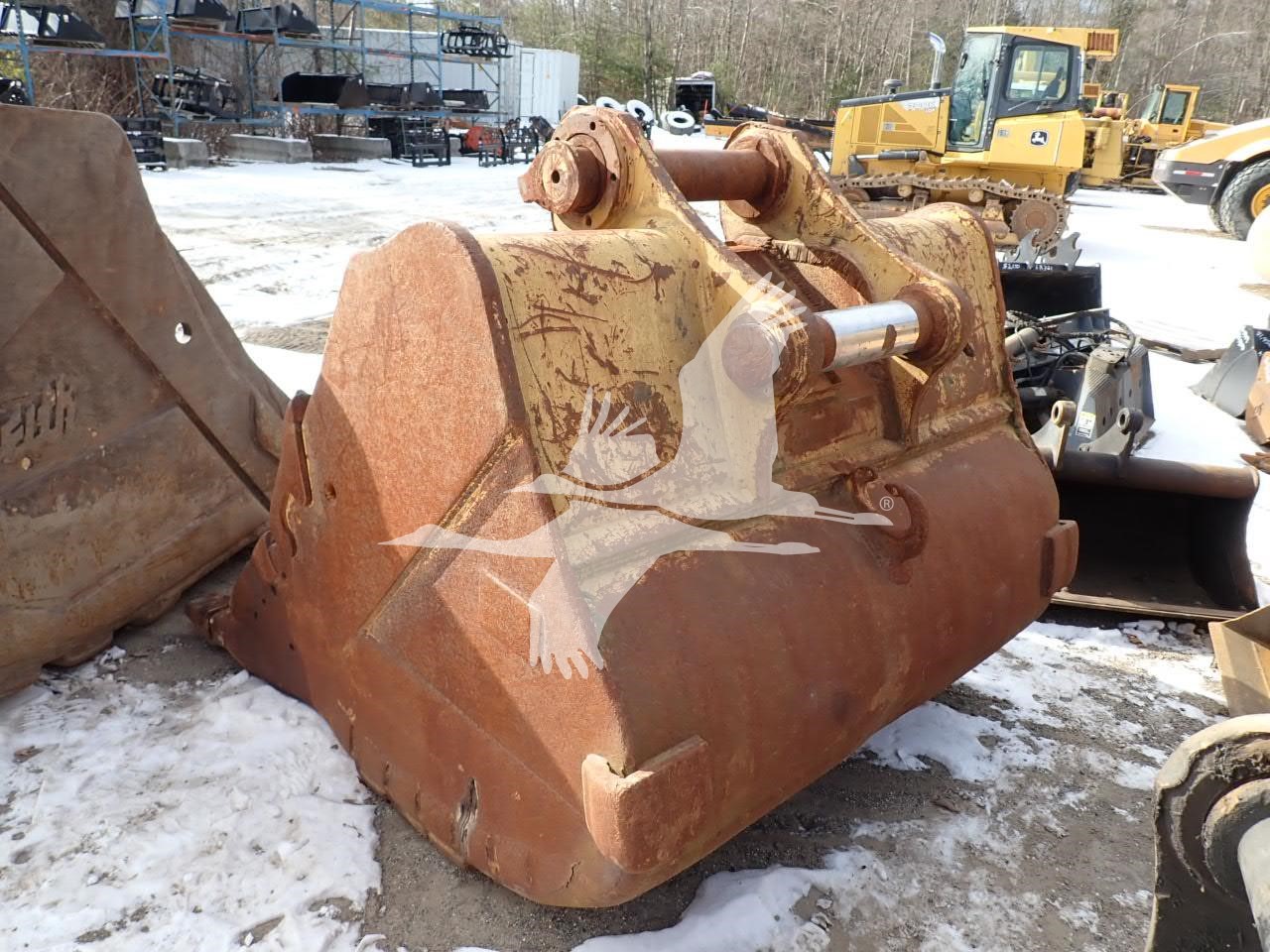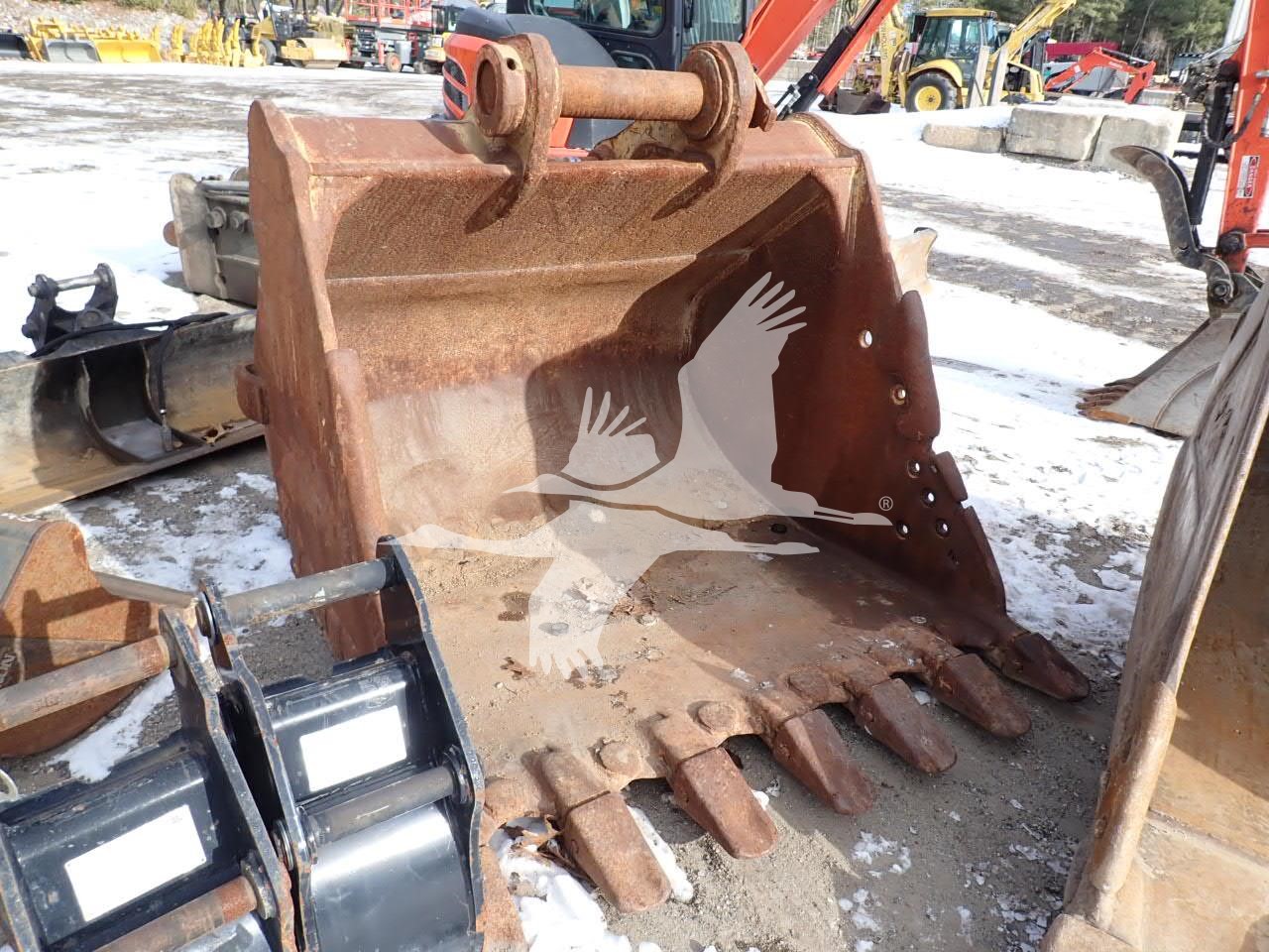 68" digging bucket, has been altered/welded to fit Hyundai 480 or similar w/ pin grabber, 17 1/4" spread, 23" center to center, 120 mm pins welded in place