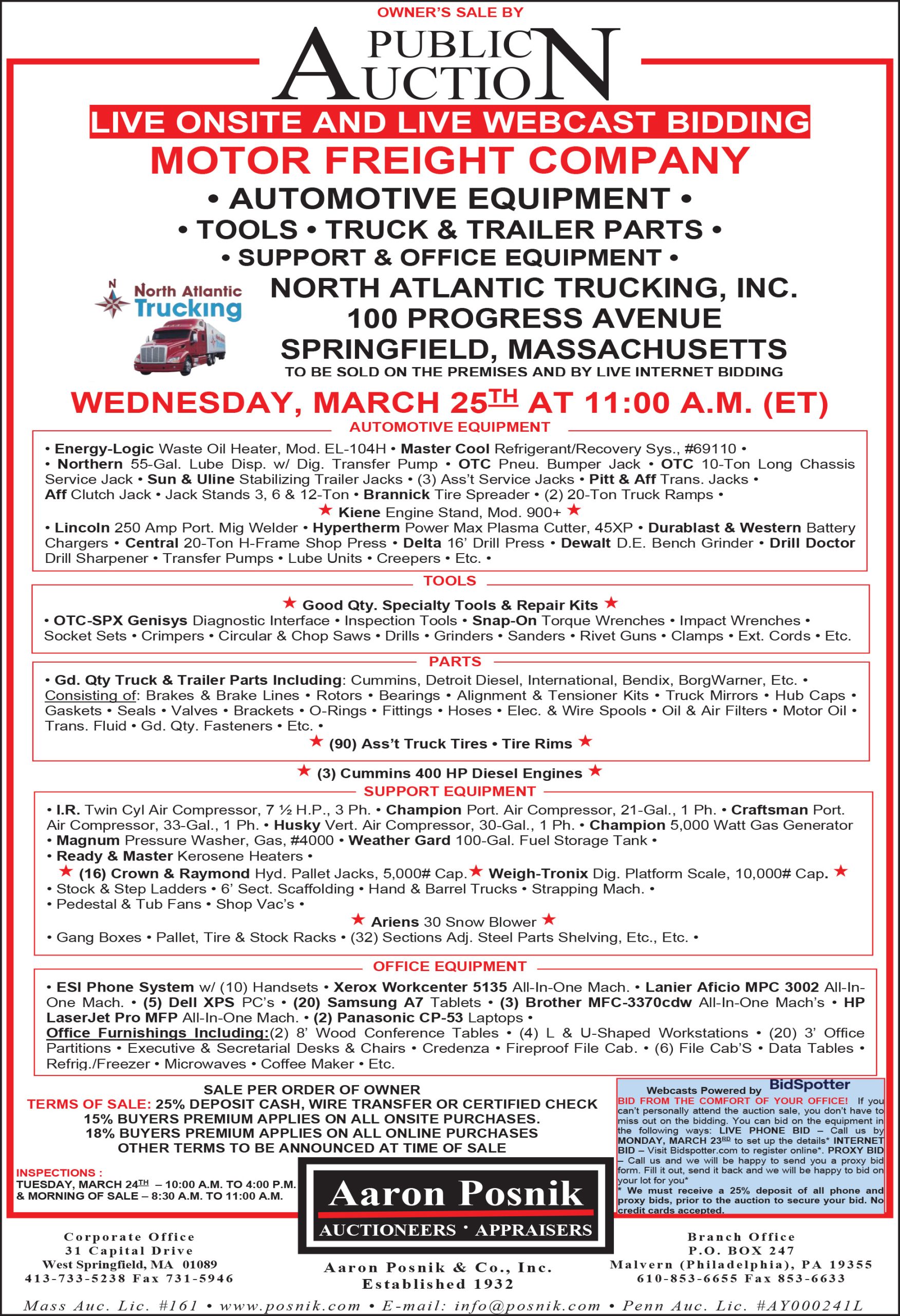 PUBLIC AUCTION - AUTO EQUIP, TOOLS, TRUCK & TRAILER PARTS, SUPPORT & OFFICE EQUIPMENT. North Atlantic Trucking, Tuesday March 25th. To be sold on the premises and live internet bidding. Aaron Posnik Auctioneers, Springfield, MA 413-733-5238